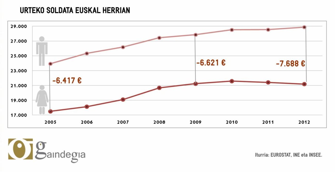 La crisis también ha dejado su impronta en la mujeres asalariadas. Según muestran los datos, en la última década, la brecha entre el sueldo anual de las mujeres y los hombres se ha ensanchado en Euskal Herria. En 2005, las mujeres cobraban de media 6.417 euros menos por año. En 2012, en cambio, la diferencia salarial llegó a los 7.688 euros: los hombres ganaron de media 28.880 euros anuales ese año en Euskal Herria, y las mujeres, 21.192 euros.