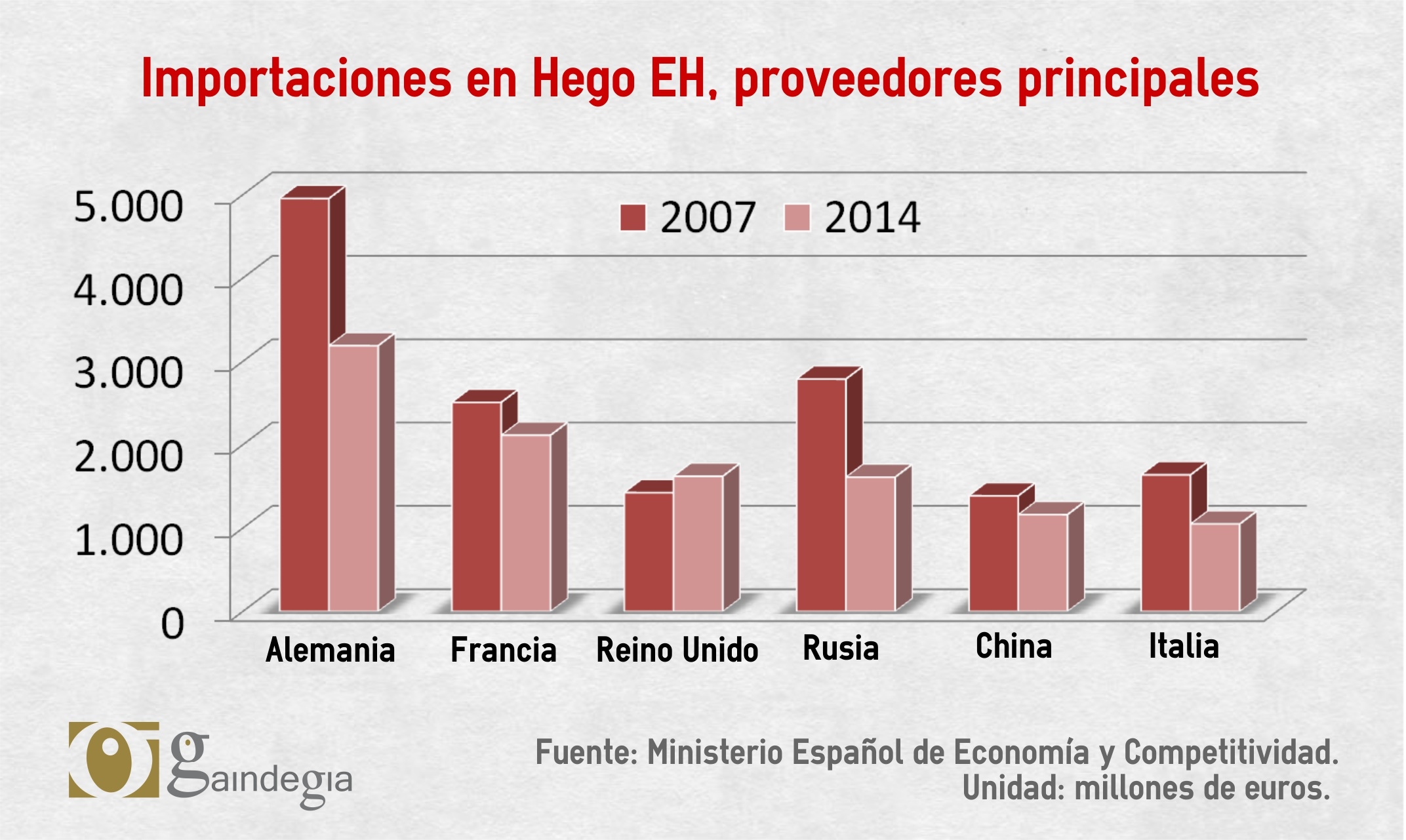 Como ocurre en el caso de las exportaciones, la mitad de las importaciones realizadas hacia Hego Euskal Herria provienen de un pequeño grupo de países, si bien desde que comenzó la crisis los suministradores son más diversos. En este momento Alemania, Francia, Reino Unido, Rusia, China e Italia son nuestros principales proveedores. Sin embargo, en el periodo comprendido entre 2007 y 2014, tan solo ha crecido el volumen importado desde Reino Unido, mientras en el resto de esos estados se han dado notables descensos. En gran medida, las fluctuaciones se han producido por culpa de los productos energéticos: el crecimiento de los productos provenientes de Reino Unido (Escocia) es prácticamente equiparable a la bajada registrada en los provenientes de Rusia.