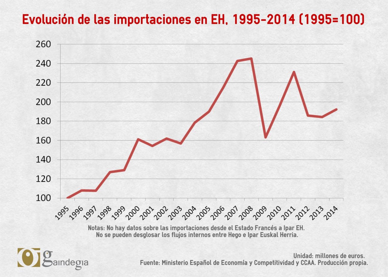 Durante el pasado año 2014 las importaciones hacia Euskal Herria superaron los 40.000 millones de euros en total, lo que supone un 44,4% del PIB. Esa cifra representa el doble de la registrada veinte años atrás, pero es inferior a la que se obtenía al comienzo de la crisis. De cualquier modo, la evolución del peso de las importaciones en los últimos años ha sido muy irregular, entre otras cosas por la influencia que tienen en ese valor los altibajos en la cotización del euro y los precios del petróleo en los mercados.