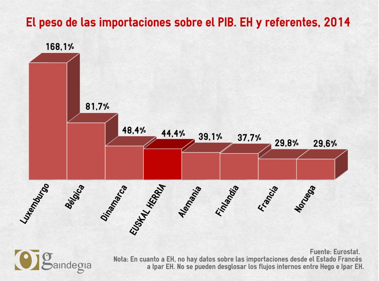 La dependencia que sufre Euskal Herria de sus importaciones es similar a la que tienen la mayoría de socios de la Unión Europea. Además, suele ser en los estados más pequeños donde mayor peso tienen las importaciones, en comparación con su correspondiente PIB. Tal es el caso de estados como Luxemburgo, Bélgica, Países Bajos y Dinamarca. La excepción la representa Noruega, un estado que con menos de cinco millones de habitantes posee sus propios yacimientos petrolíferos. Tener esos recursos propios le ayuda a reducir de forma notable su dependencia de las importaciones. Euskal Herria se encuentra a medio camino, en situación similar a la de Alemania, países ambos de gran tradición industrial que necesitan importar mucha energía para mantener sus producciones.