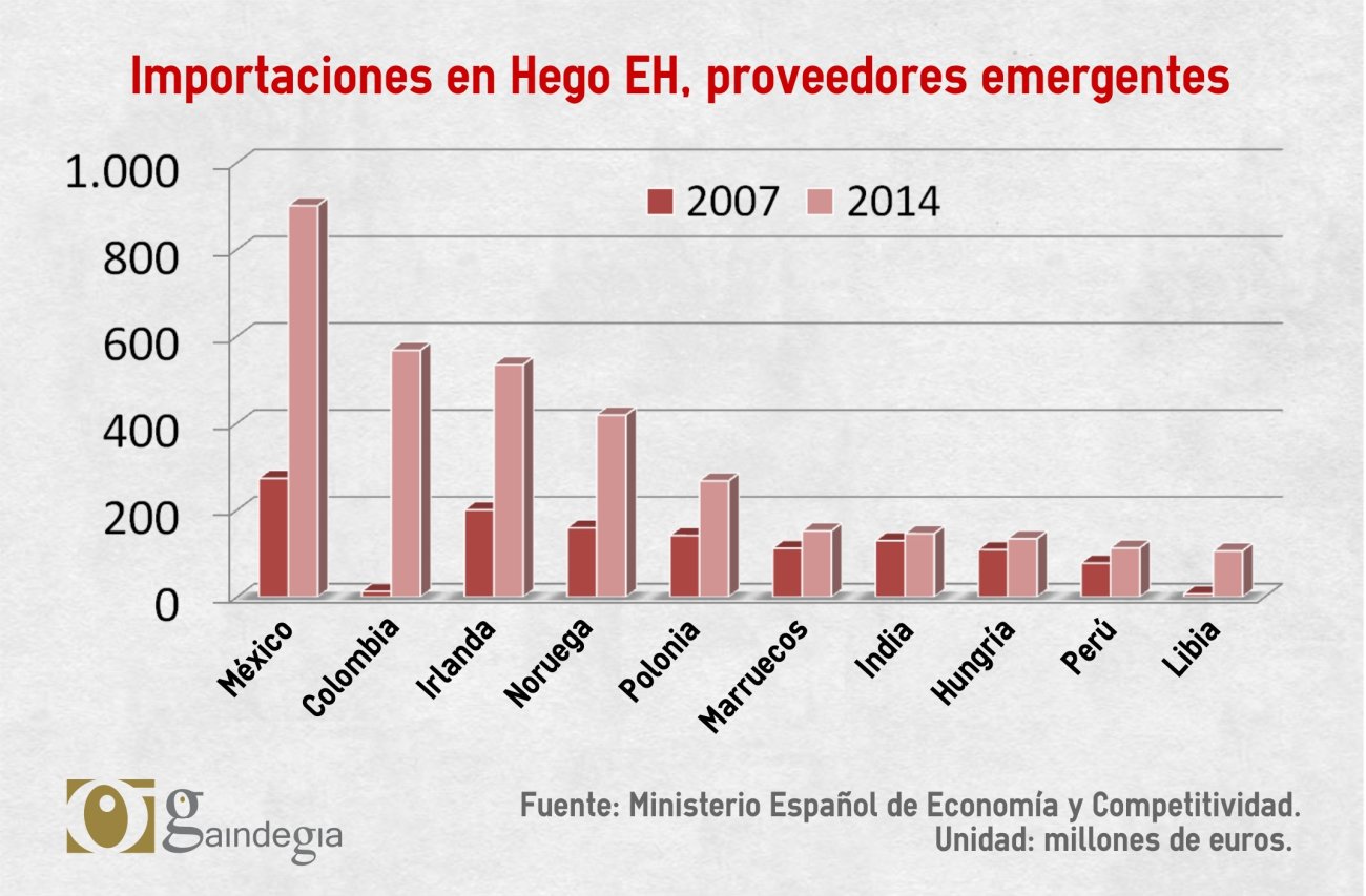 En cuanto a los países que están al alza como suministradores, la mayoría amplían su presencia en nuestro mercado por medio de productos energéticos. Entre ellos se encuentran México, Colombia, Noruega y Libia. Como ocurre con la mayoría de países de la Unión Europea, Euskal Herria está diversificando la procedencia de sus importaciones en el área energética, intentando evitar la excesiva dependencia de los suministradores tradicionales, como Rusia, a la vez que buscando precios más económicos. Con todo, tanto en el campo de la energía como en otros muchos, dar pasos hacia la soberanía y potenciar la economía local puede ser un modo eficaz para evitar una excesiva dependencia de las importaciones.