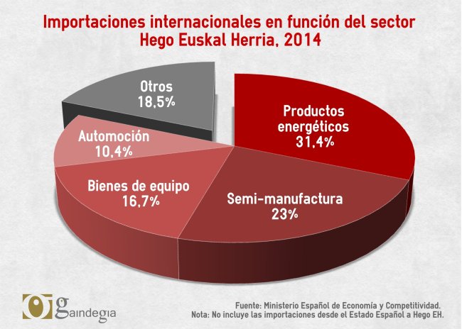 En el caso de Hego Euskal Herria, los productos energéticos suponen casi un tercio del valor total de sus importaciones, en su mayoría de petróleo. Otros sectores que también tienen peso en el volumen total de las importaciones que nos llegan son los productos semi-manufacturados, los bienes de equipo y la automoción. Los alimentos no se encuentran en la lista de los principales productos importados, pero lo cierto es que Hego Euskal Herria presenta un saldo negativo en este área, debido a que las importaciones de alimentos superan a las exportaciones. Tenemos que tener presente que a menudo importamos desde países muy lejanos productos que ya disponemos aquí, con la disculpa de que son más baratos.