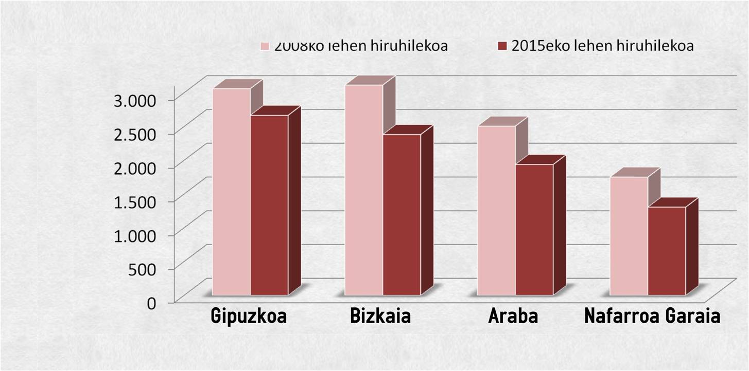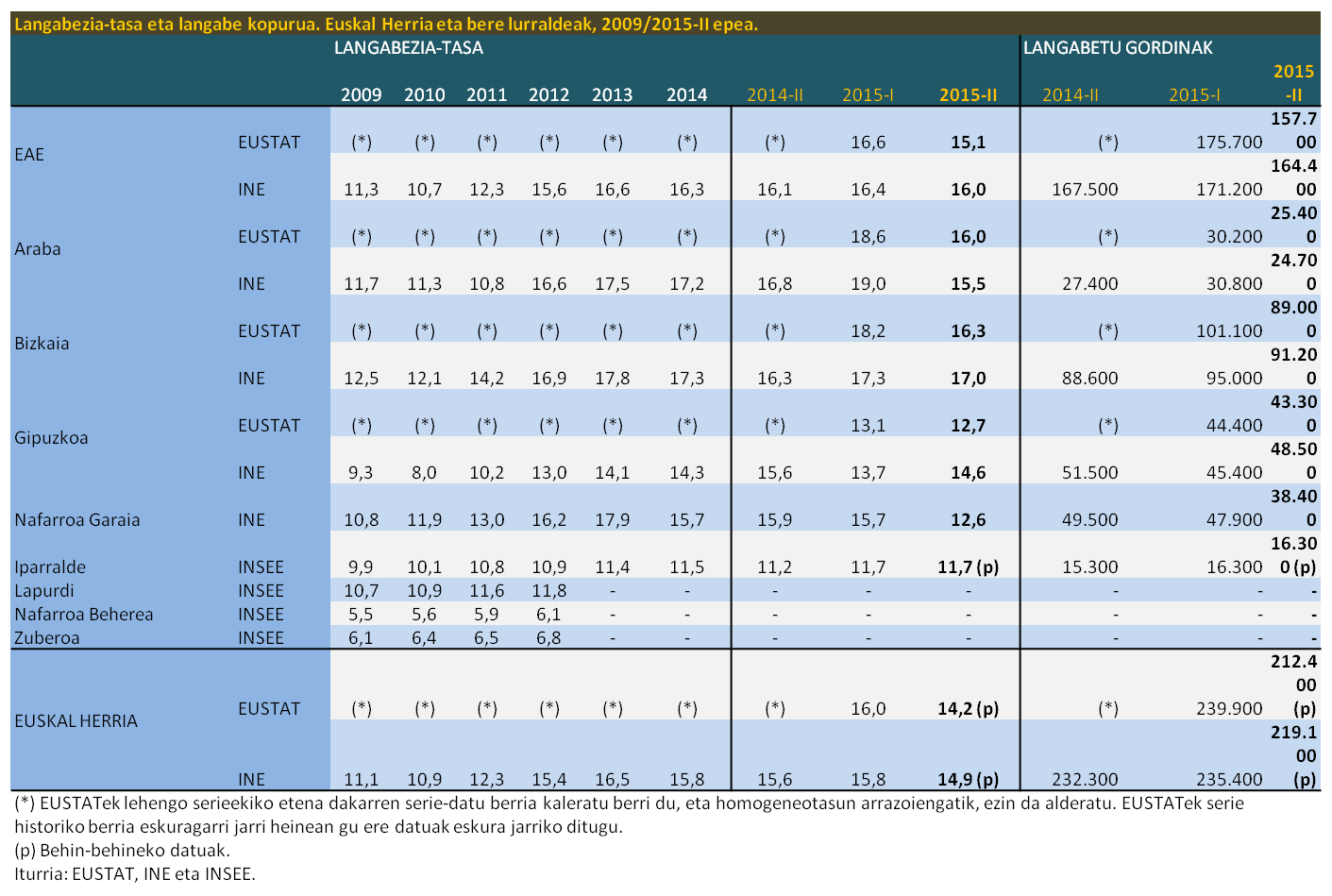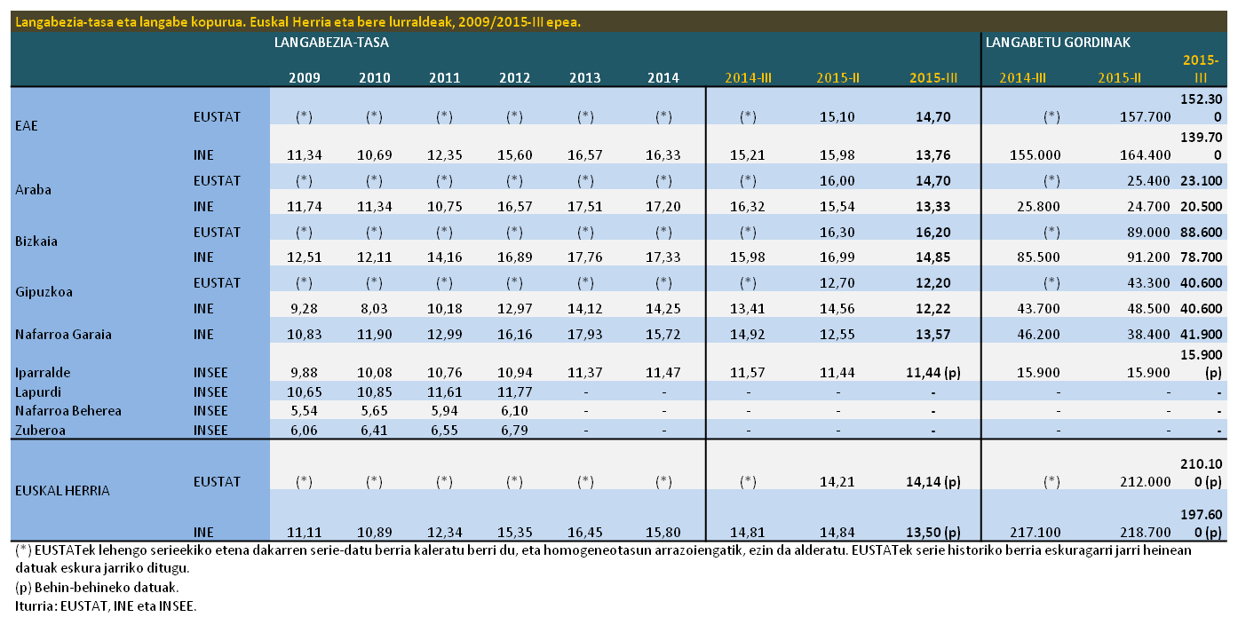 Según los datos del tercer trimestre de 2015, la tasa de desempleo de Euskal Herria es del 13,5%, 1,3 puntos menos que en el trimestre anterior y el mismo trimestre del año pasado.