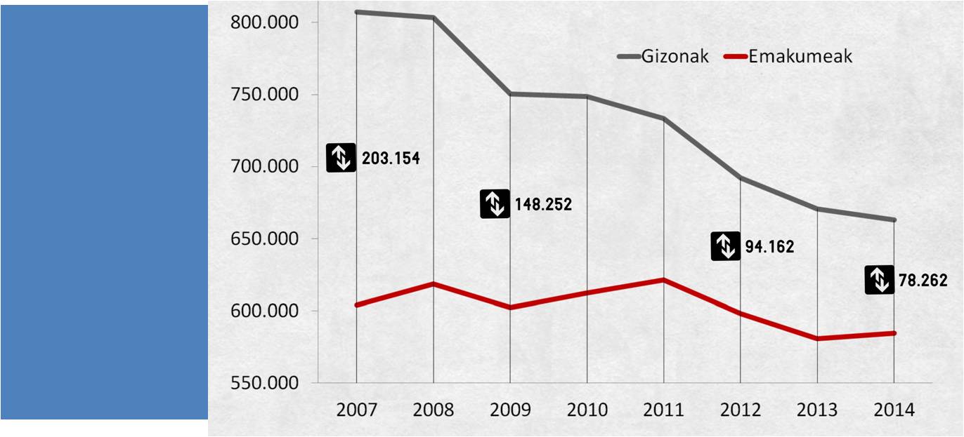 Durante la crisis se ha equiparado el número de hombres y mujeres ocupados, pero no sus condiciones laborales. El diferencial salarial entre hombres y mujeres ocupados se sitúa en una media de 7.688 euros al año en Euskal Herria. Para entender de donde procede semejante diferencia es conveniente fijarse en los puestos de trabajo y en las contrataciones de unos y otros.