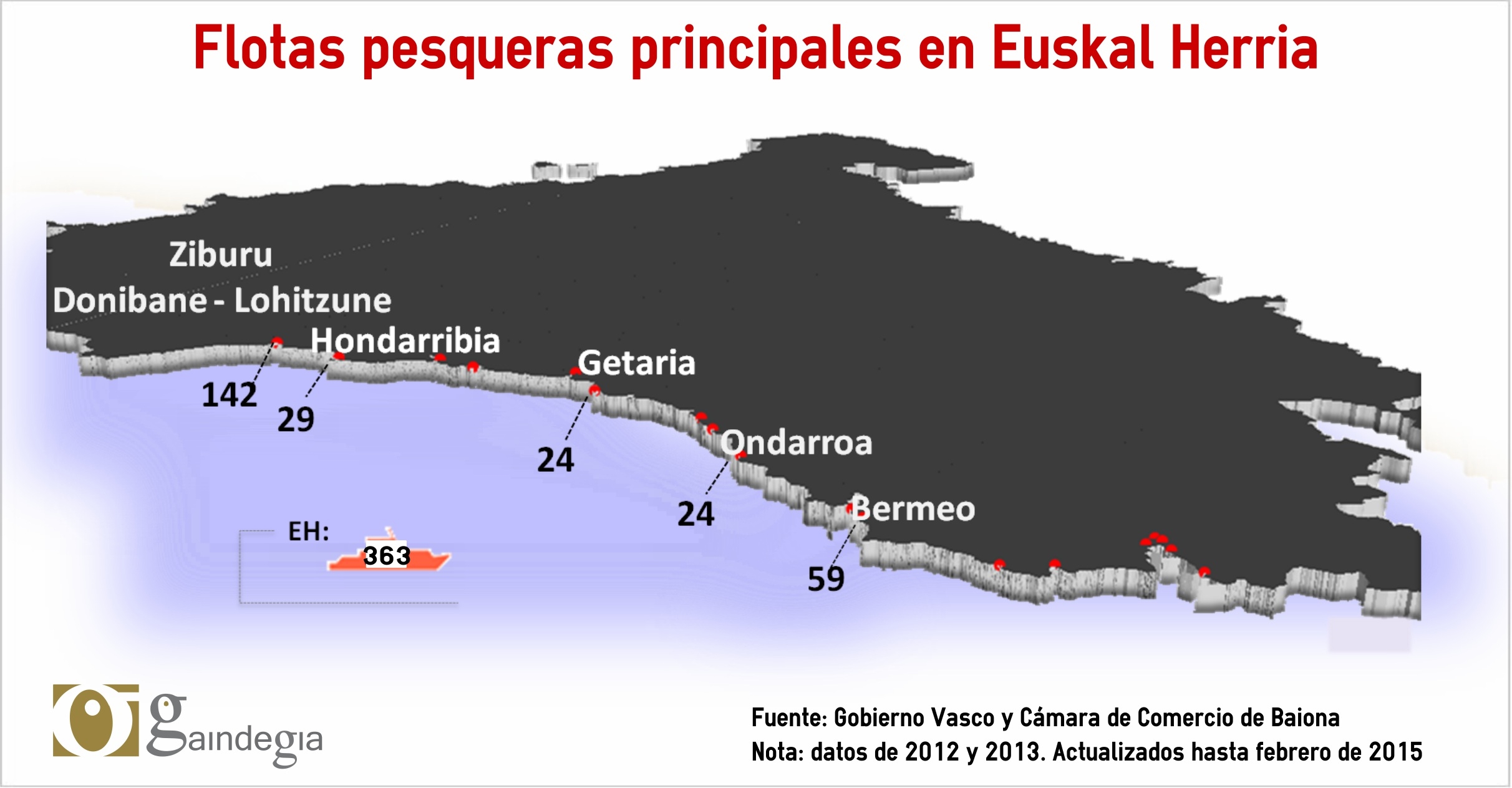 La flota pesquera de Euskal Herria dispone de 363 embarcaciones. De ellas, 93 faenan desde puertos de Gipuzkoa, 125 desde puertos de Bizkaia, 142 desde Lapurdi y 3 desde otros lugares. En el periodo comprendido entre los años 2002 y 2012 el descenso experimentado ha sido del 37%, si bien el declive se inició con anterioridad.