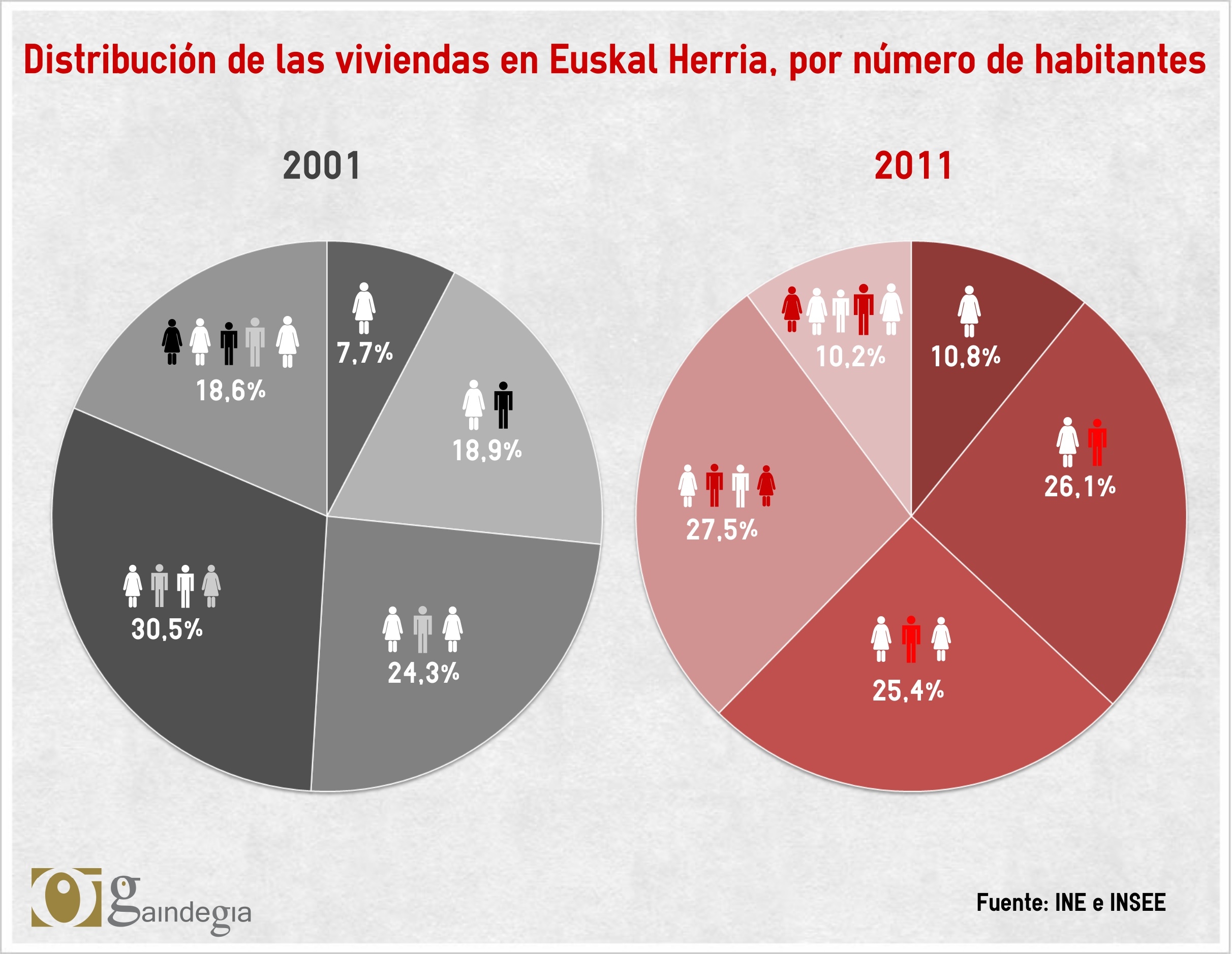 En las últimas décadas la estructura de las familias ha cambiado notablemente, en especial en los últimos años. En Euskal Herria, según los datos más recientes (2011), el promedio de personas que convive en una vivienda se sitúa en 2,4. En cambio, diez años atrás, en 2001, ese mismo promedio era de 2,8, lo que supone un notable descenso.