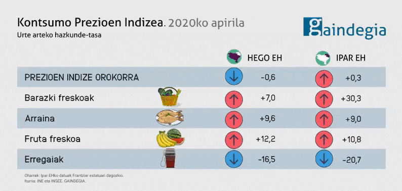 2020ko apirilean Kontsumo Prezioen Indizeak aurreko hileko joeraren bidean mantendu eta, Hego Euskal Herrian, hazkunde negatiboa izan du. Ipar Euskal Herrian, aldiz, prezioen hazkundea apala izan da. Erregaien prezio gainbeherak elikagaien prezio gorakadarekin bat egin du denboran.