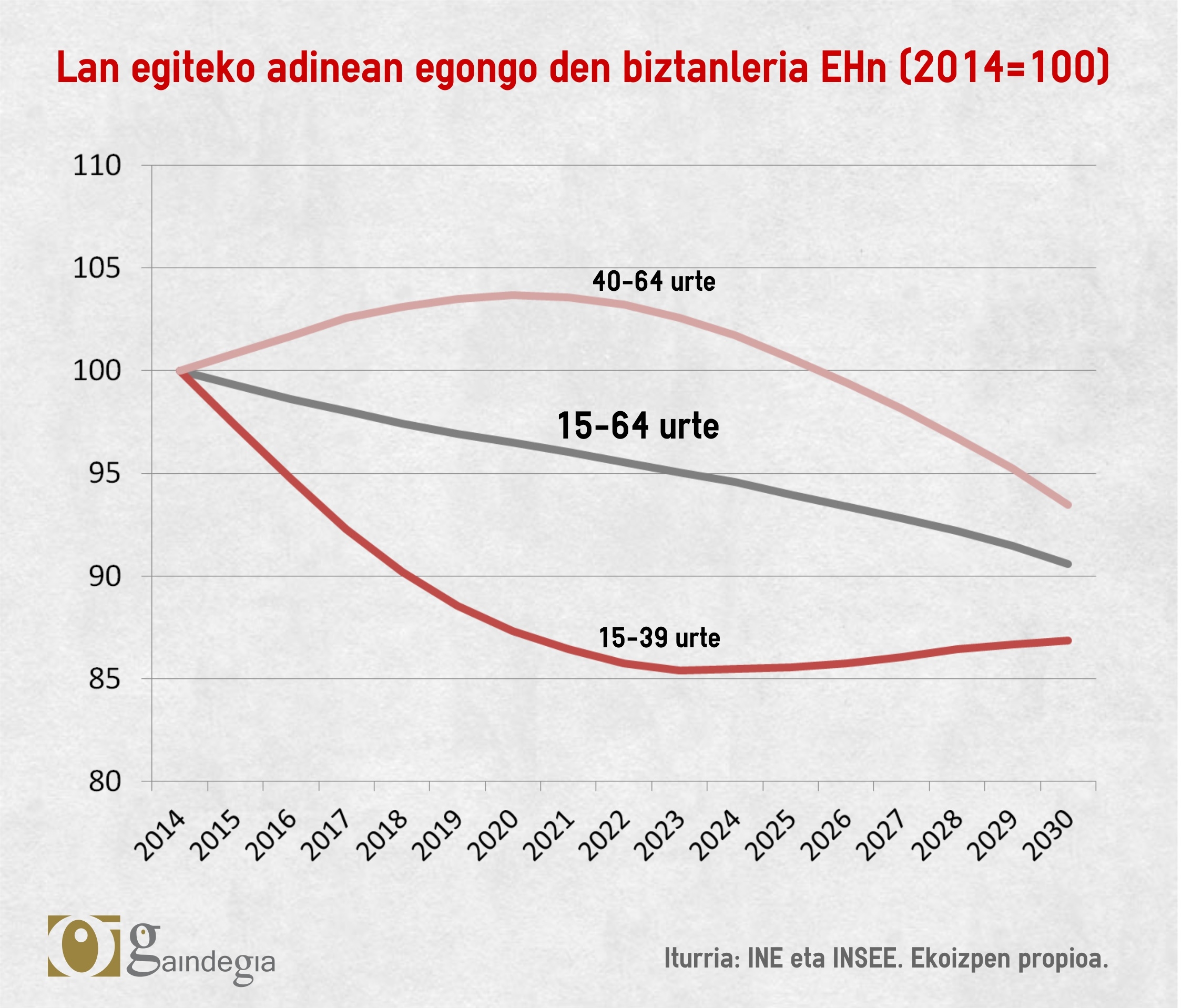Arazo handiena zera da, inon gutxi murriztuko dela 15 urtetik beherako biztanleriaren proportzioa Euskal Herrian adina, eta horrek eragin sakona izango du datozen hamarkadetan lanean egiteko adinean egongo den euskal herritar kopuruari dagokionez. Gainbehera oso nabarmena aurreikusten da: 2030erako ia hamar puntu jaitsiko da 15-64 urte artekoen kopurua. Horrek askotariko ondorioak izango ditu; besteak beste, pentsio sisteman eta osasun eta zaintza zerbitzuetan egin beharko diren inbertsio publikoetan.