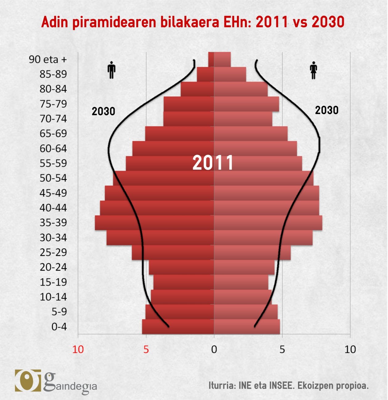 Dena dela, Hego Euskal Herriko biztanleria nabarmen handiagoa denez, oro har oso zahartuko da Euskal Herriko adin-piramidea datozen hamabost urteotan. Datu bat ematearren, 2030erako gehiago izango dira 85 urtetik gorakoak 10 urtetik beherakoak baino.