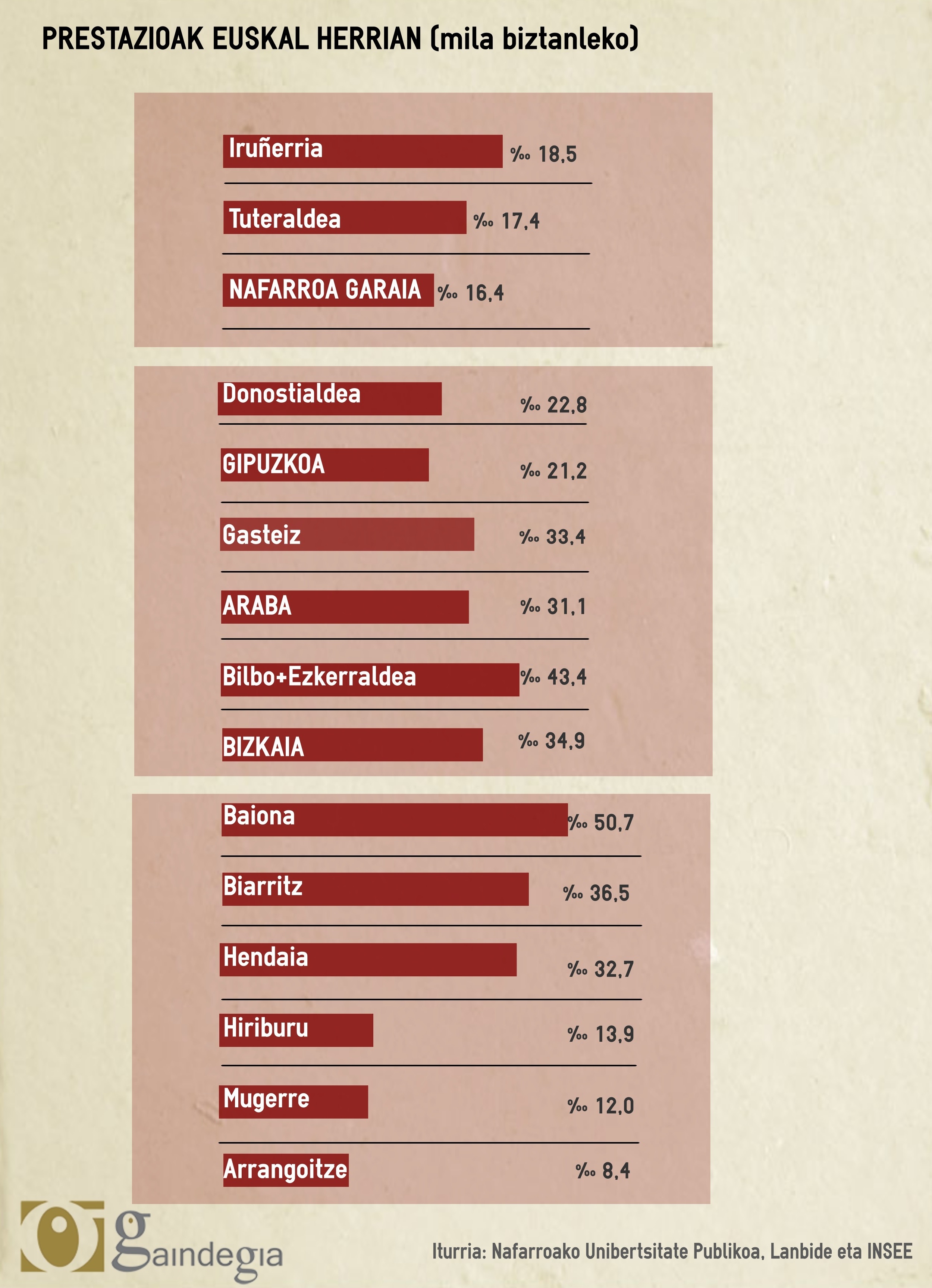Gizarte behar larriak dituzten pertsonek administraziotik jasotzen dituzten prestazioak ere izan daitezke pobreziaren isla, eta hor are nabarmenagoa da hirien eta herrien arteko aldea. Euskal Herriko bost metropoli nagusietan mila biztanleko jasotzen den prestazio kopurua dagokion herrialdeko batez bestekotik gora dago.Kasu honetan ere, bereziki larria da egoera Bilbo Handian eta Baionan. Bilbon eta Ezkerraldean mila biztanleko jasotzen den prestazio kopurua (RGIa, kasu honetan) Bizkaiko batez bestekoa baino 8,5 puntu handiagoa da. Baionan, bestalde, mila biztanleko 50 lagunek jasotzen dute RSA izeneko prestazioa. Hiriburun, esaterako, mila biztanleko 14 lagunek baino ez dute jasotzen prestazio hori.