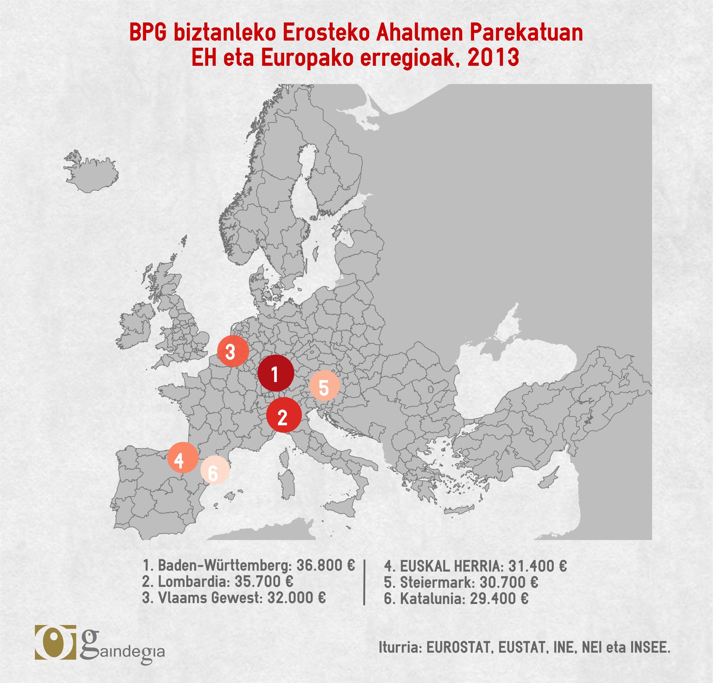 Hain zuzen, Europar Batasuneko batez bestekoarekin alderatuta, Euskal Herriko BPGa handia da, EBn 26.600 eurokoa izan baitzen biztanleko 2013an. Lurralde industrialekin konparatuz gero, Alemaniako Baden-Württembergek (36.800 euro) eta Italiako Lombardiak (35.700 euro) alde handia ateratzen diete gainontzeko erregioei, baina Euskal Herria Katalunia (29.400 euro) eta Austriako Steiermark (30.700 euro) baino hobeki kokatuta dago.