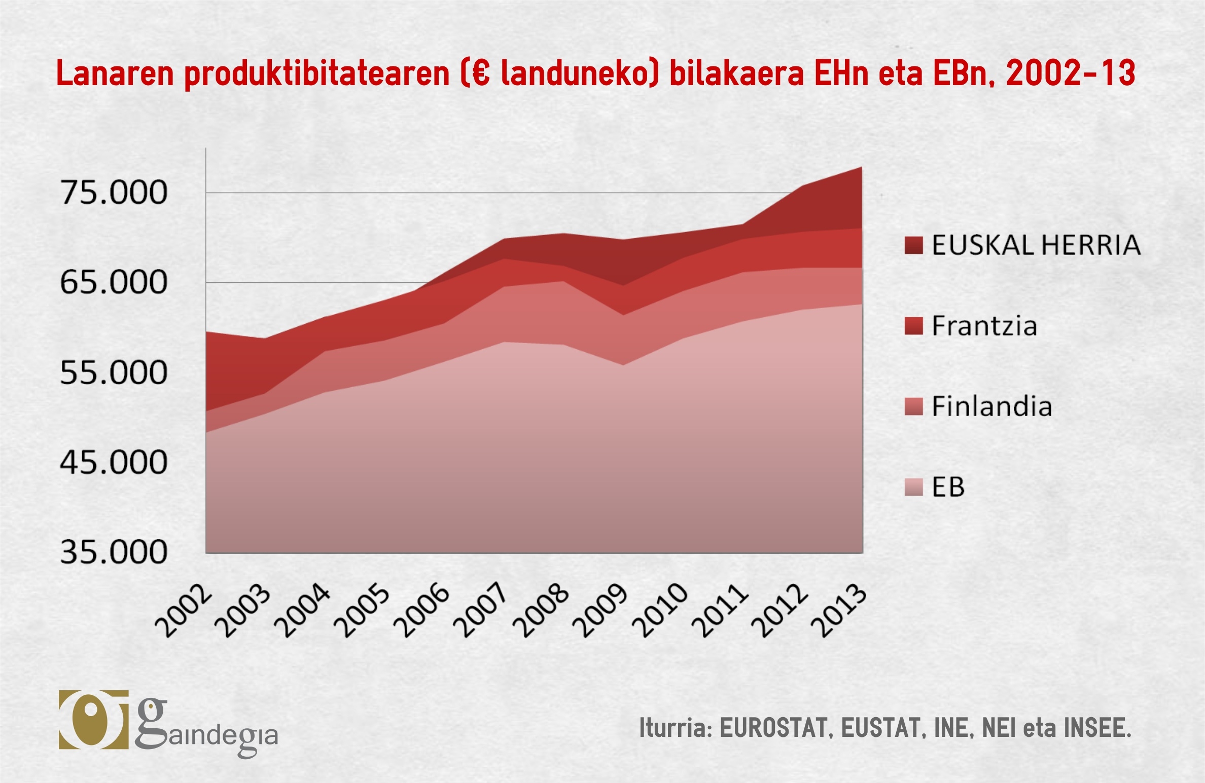 Lanaren produktibitatearen hazkundea oso fenomeno orokortua izan da EBn azken urteotan: EHn %31 hazi da 2002tik 2013ra, eta ia %12 2009tik 2013ra; EBko batez bestekoaren pare. Dena dela, deigarria da ikustea zer bilakaera izan den urtez urte gurean adierazle honi dagokionez: 2009an, krisiak industria jo zuenean, jaitsiera nabarmena izan zen EBn lanaren produktibitatean; Euskal Herrian ere jaitsi zen, baina askoz ere gutxiago. Lan prekarietatearen adierazle izan daiteke hori.