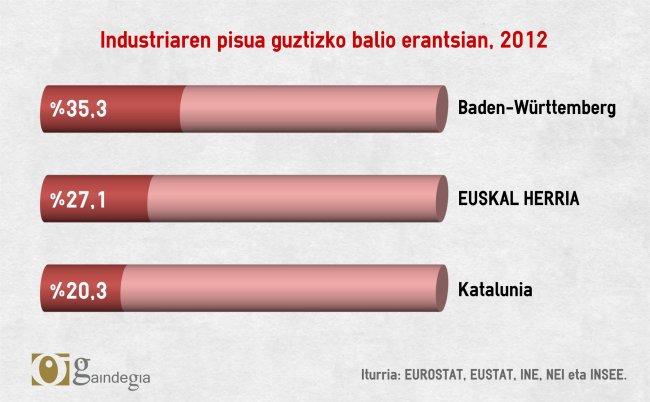 Dena dela, bilakaera kezkagarria daramagu gurean. BPGa goranzko joeran bada ere, industriak pisua galdu du ekonomian, eta industria da ekonomia bati aberastasun gehien ekartzen dion alorra, hain zuzen. Datu bat ematearren, Baden-Württembergen guztizko balio erantsiaren %35,3 dator industriatik.