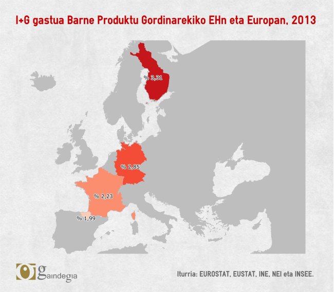Euskal Herriak bere BPGaren %2,07aren pareko gastua egin zuen I+Gan 2012an, inoizko zifrarik onena. Baina 2013koak dira daturik berrienak eta hor beherakada nabarmena egin du: %1,99ra jaitsi da. Alemaniak eta Frantziak, aldiz, eutsi egin diote gastuari, eta Finlandia jaitsi egin da, baina bere zifrak EHkoak baino nabarmen hobeak ziren lehendik ere. Europa 2020 estrategiaren arabera, EBko herrialde guztiek BPGaren %3aren pareko gastua egin behar dute I+Gan bost urte barru. Horrenbestez, Euskal Herria oso urrun dago helburu horretatik, eta atzera doa, gainera.