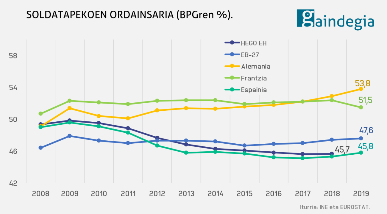 Ekonomiaren finantzarizazioa gorabidean dago eta Euskal Herria ez da salbuespena. Euskal ekonomiak jarduera produktiboetan ardatz izanik ere, soldatapekoen ordainsariek gero eta pisu txikiagoa dute BPGren barruan. Hala, soldatapekoen ordainsariek Hego Euskal Herriko BPGren %45,7a osatzen dute (2018), Europar Batasunean (EB-27), ordea, BPGren %47,3a (2019). Frantzian, Danimarkan, Alemanian, alokatuen ordainsariek BPGren gainean pisu handiagoa dute.
