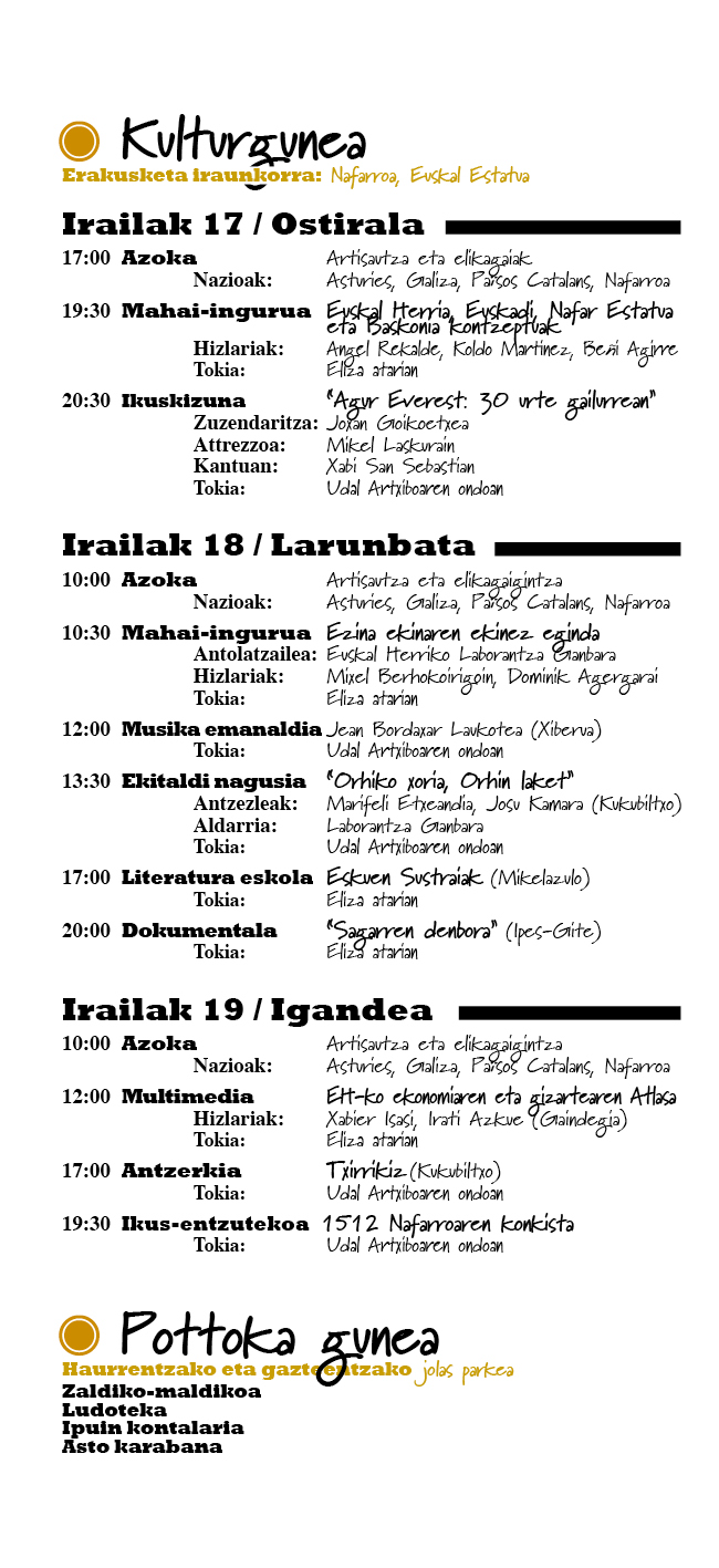 Afin de favoriser et développer la culture basque les jours de du 17 à au 19 septembre en Bergara aura lieu le Parc Thématique Orhipean. Cet événement à caractère de fête réunira à divers agents culturels qui composeront un vaste programme et varié organisé par Nabarralde et Txoria Txori Egitasmoa. Gaindegia prendra part l'événement dimanche à partir du 12:00.